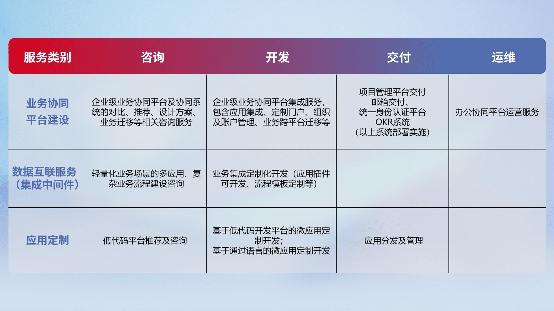 针对钉钉、、、企微、、IDaas等平台级产品提供产品的规划、、、、方案、、、、交付、、、定制化开发等服务,,,实现如统一协同办公、、、智能客户服务、、、混合会议管理、、智能数据查询、、、等业务场景,,,,实现数字化转型。。