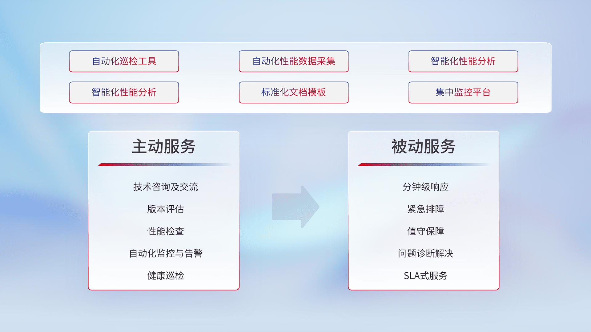 智能化工具和标准化文档,,,保障服务质量,,,,提供主动服务(包含技术咨询、、、、版本评估、、、、性能检查、、自动化监控与告警、、、健康巡检)和被动服务包含(分钟级响应、、紧急排障、、、、值守保障、、、、问题诊断解决、、SLA服务)。。。。